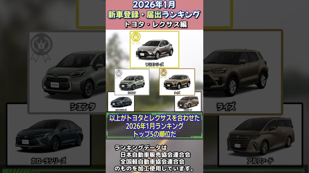 2026年1月トヨタ・レクサス新車登録・届出ランキングTOP5