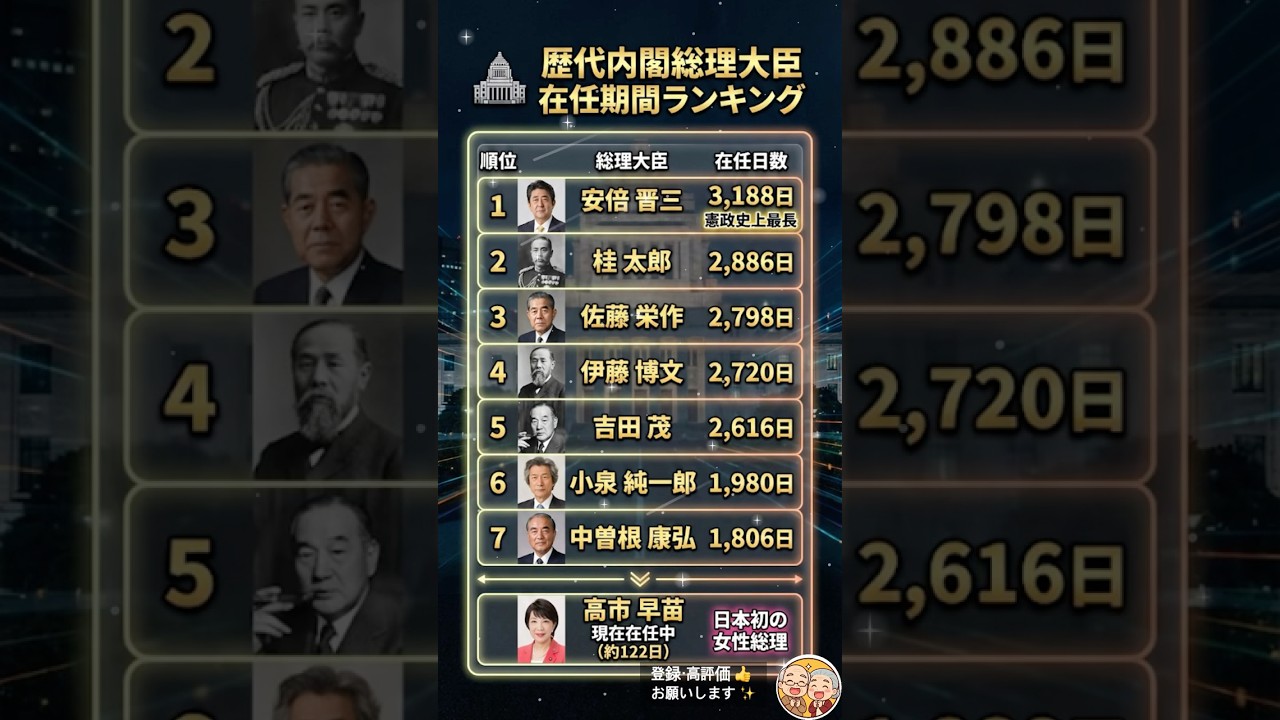 スポンサーリンク歴代内閣総理大臣「在任期間」ランキング!日本を変えたリーダーは?スポンサーリンクPeople & BlogsTwitterFacebook0はてブ0Pocket0LINEコピー2026.02.22<動画情報> 動画作成者またはチャンネル等 ささやかな話 動画の再生時間 00:05 公開日 2026-02-22 09:10:00