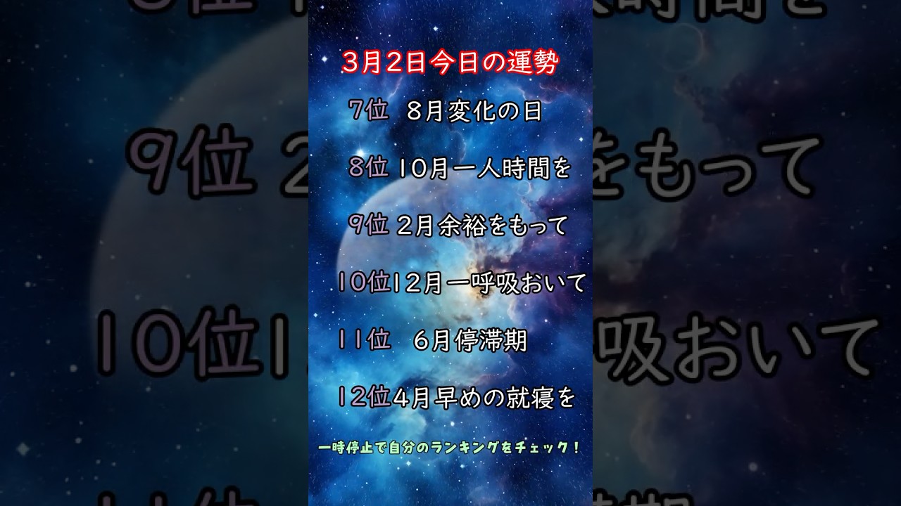 スポンサーリンク【毎日占い】3月2日運勢ランキング #占い #月占い #癒し #開運#今日の占い#今日の運勢#ランキング#shorts #shortvideo #shortスポンサーリンクEntertainmentTwitterFacebook0はてブ0Pocket0LINEコピー2026.03.02<動画情報> 動画作成者またはチャンネル等 ミルの毎日占い 動画の再生時間 00:11 公開日 2026-03-02 06:30:06